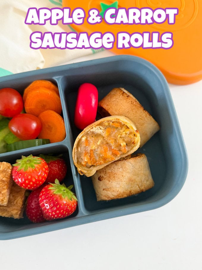Tasty sausage rolls packed with apple and carrot and made using tortilla wraps. No pastry required! Great for school lunchboxes or lunch at home.