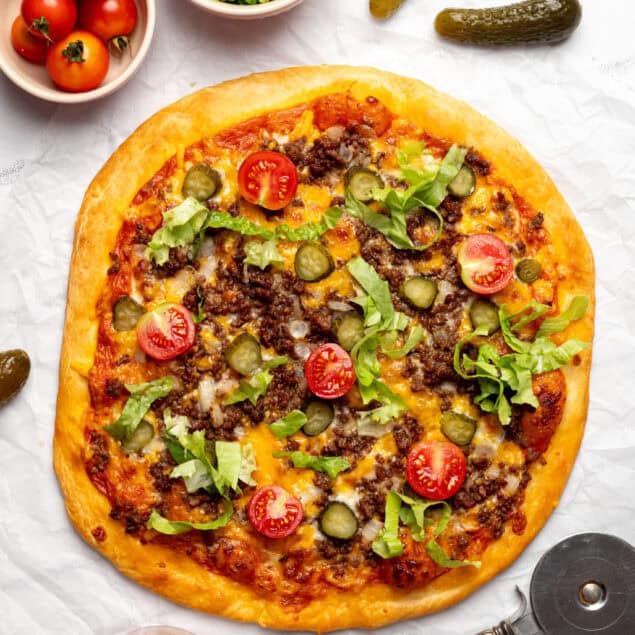 You can also use this Focaccia Recipe or Gluten-Free Focaccia Recipe as the base for your pizza. Serve your cheeseburger pizza with a Caesar Salad, Tossed Salad, or Chopped Salad.
