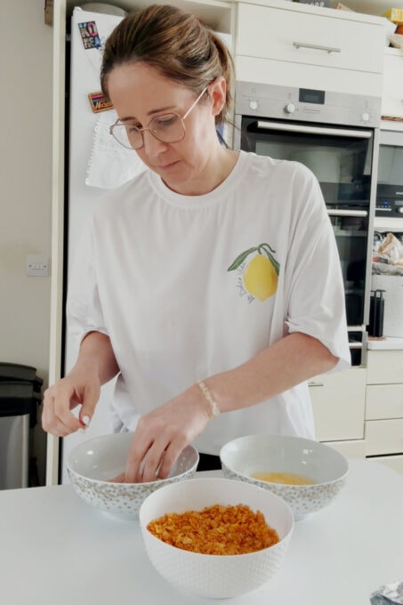 - Add flour to one bowl, crack the eggs in to a second bowl and add the cornflakes, oil and seasoning to a third bowl.