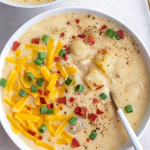 This crockpot potato soup recipe is perfect for meal prep or as a make ahead meal, and reheats very well. In fact, I think it’s even tastier the next day!