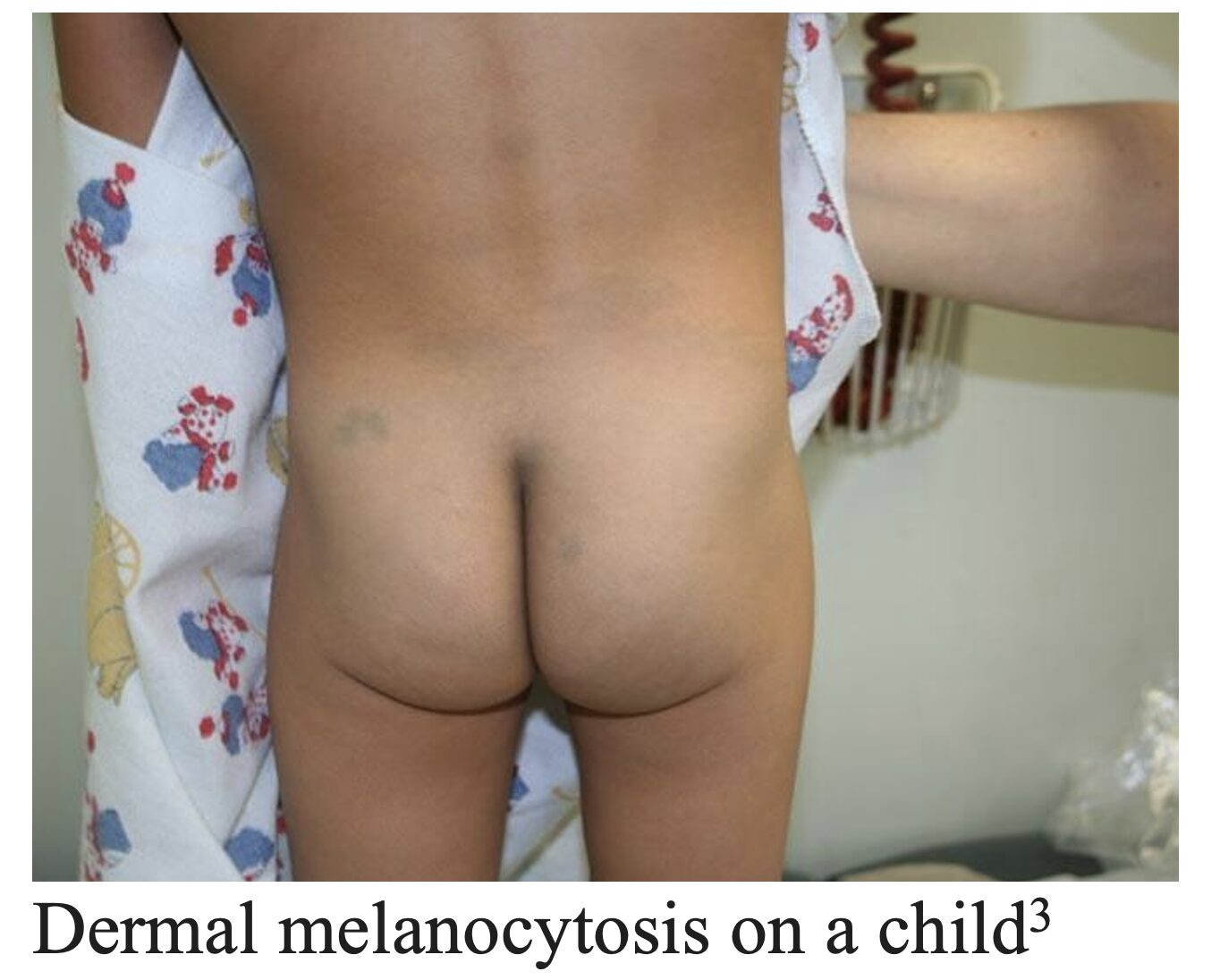 - Mimics/Differential Diagnosis: accidental bruising in ambulatory child (forehead, shins, knees), coagulopathies (Factor V Leiden, von Willebrand), disorders of collagen (Ehlers-Danlos), dermal melanocytosis (formerly known as Mongolian spot), coin rubbing/cupping/moxibustion (cultural practices), port-wine stains (HSP, ITP).