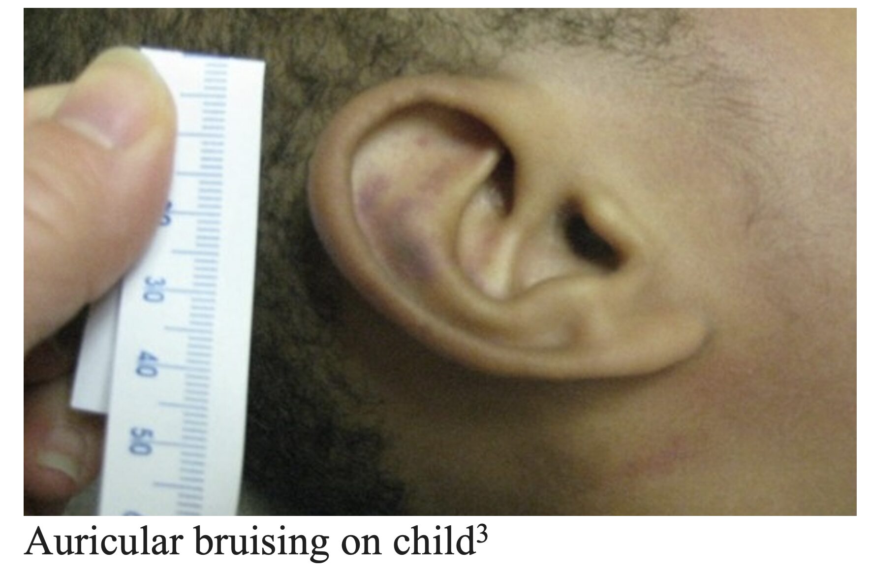 Bruises raising concern for nonaccidental trauma can be screened from accidental injury using a clinical decision rule suggested by the mnemonic TEN-4-FACESp: bruises to the torso, ears, neck, any bruising in those ≤ 4 months of age, frenulum tear, bruising of the angle of the jaw, fleshy cheek, eyelid, or sclera, or any bruise with a pattern. This decision tool should only be used in patients < 4 years of age.
