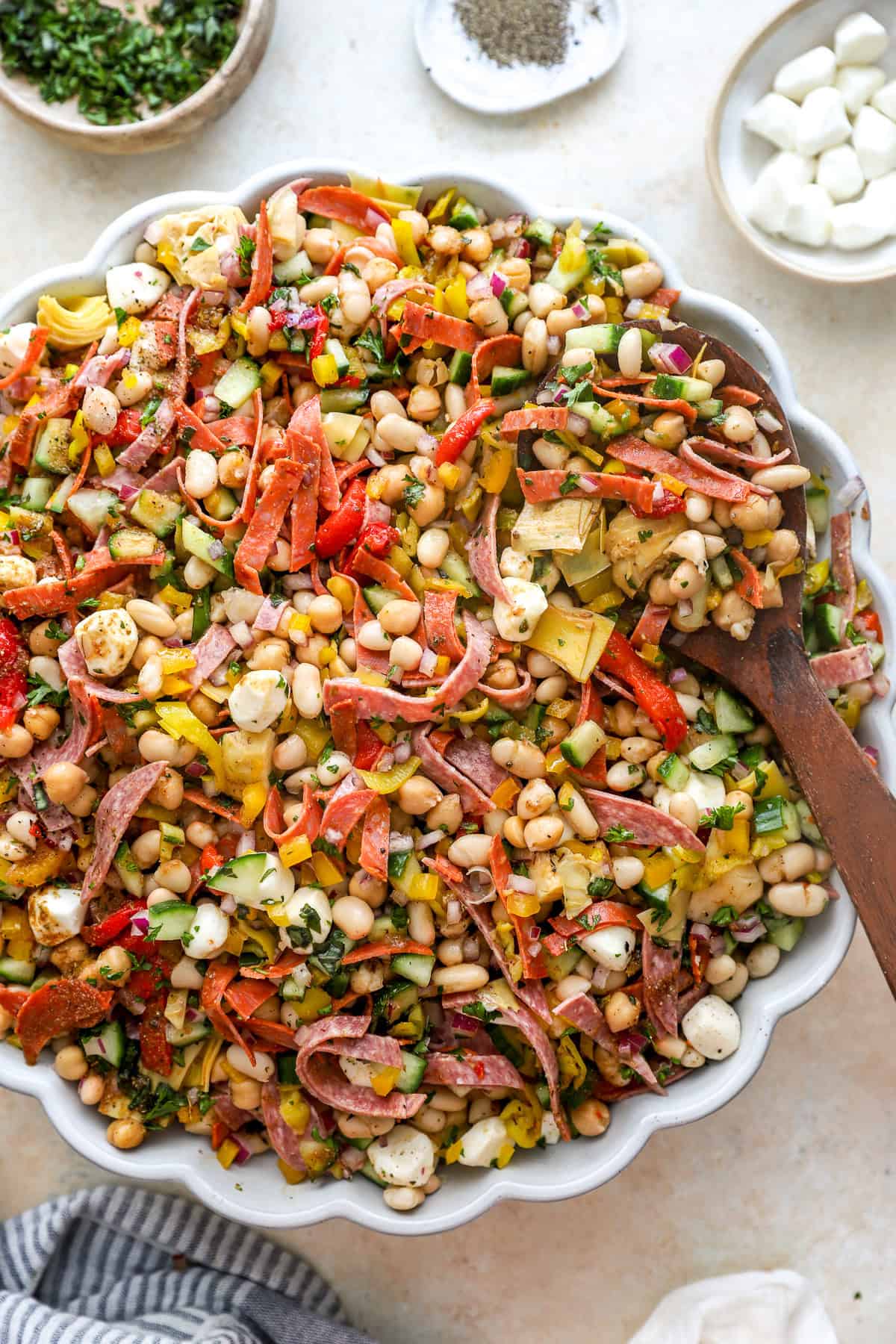 In a large mixing bowl, combine the beans, bell pepper, onion, cucumber, salami, turkey pepperoni, pepperoncini, artichokes, mozzarella, and fresh herbs.