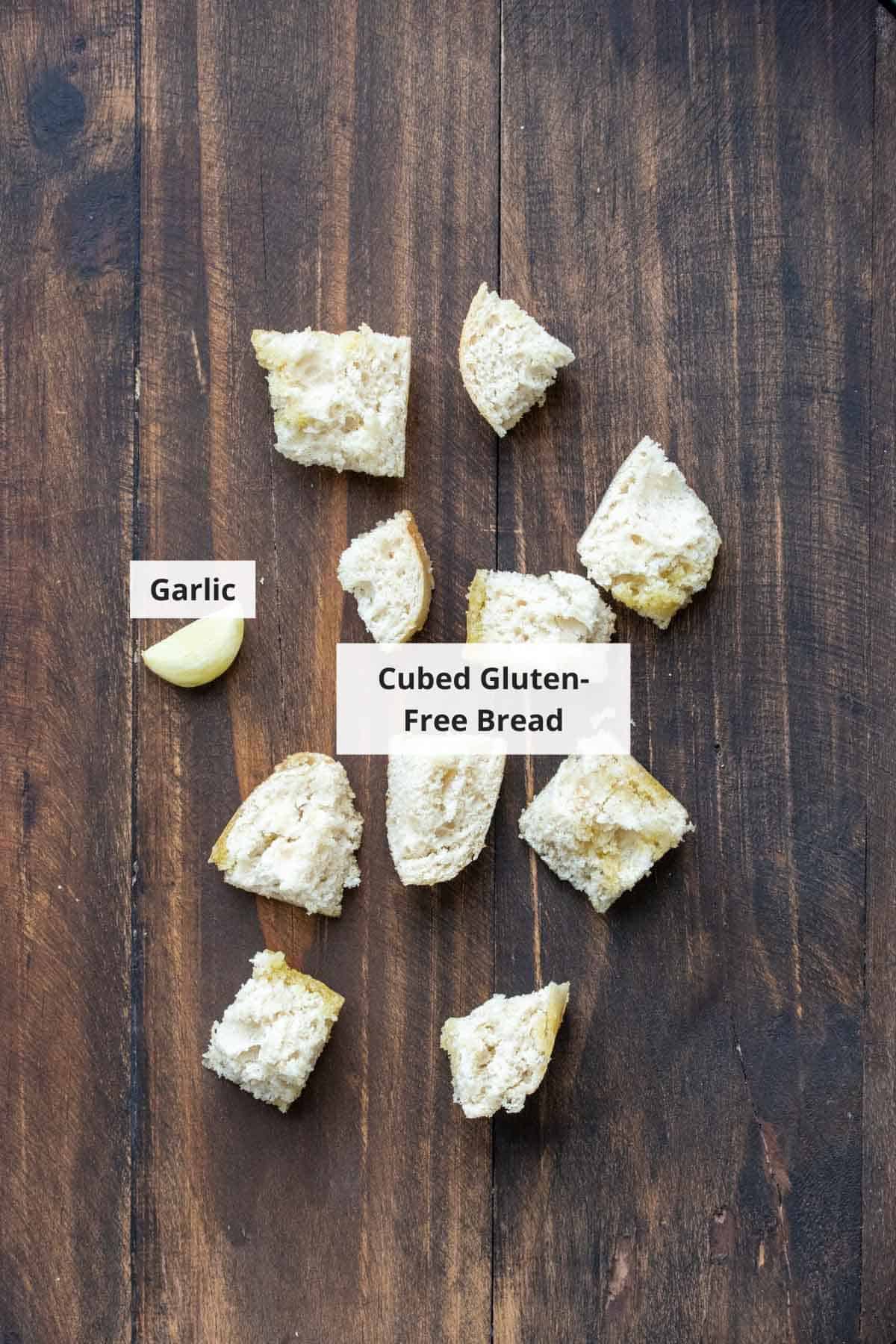 Cubed gluten free bread: I cut up leftover gluten free bread into small cubes, and it is the perfect way to use up pieces that might go to waste. Once baked, they turn crispy and golden.