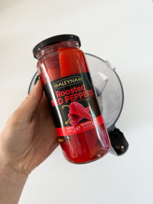 - Drain a jar of roasted red peppers and rinse under cold water. This helps remove the vinegar that the peppers are stored in.
