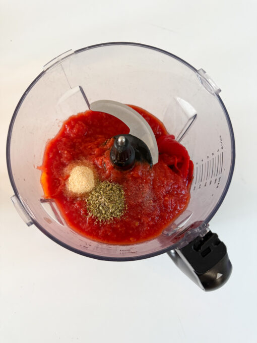 - Add to a food processor along with a tin of chopped tomatoes, oregano, garlic powder and a little salt and pepper.