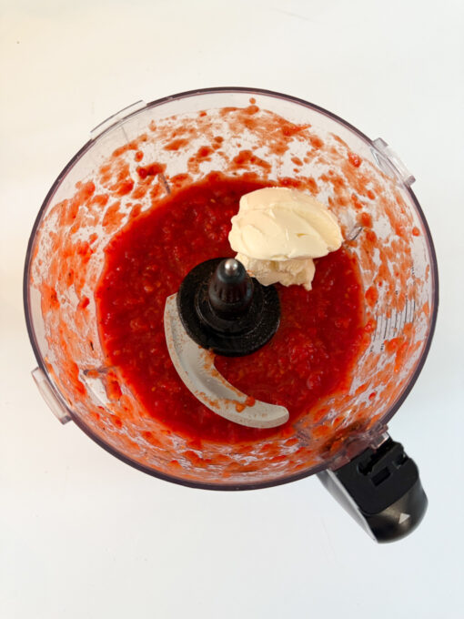 - Blitz until smooth and add in a little cream cheese. Blitz again for just a few seconds to combine.