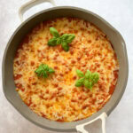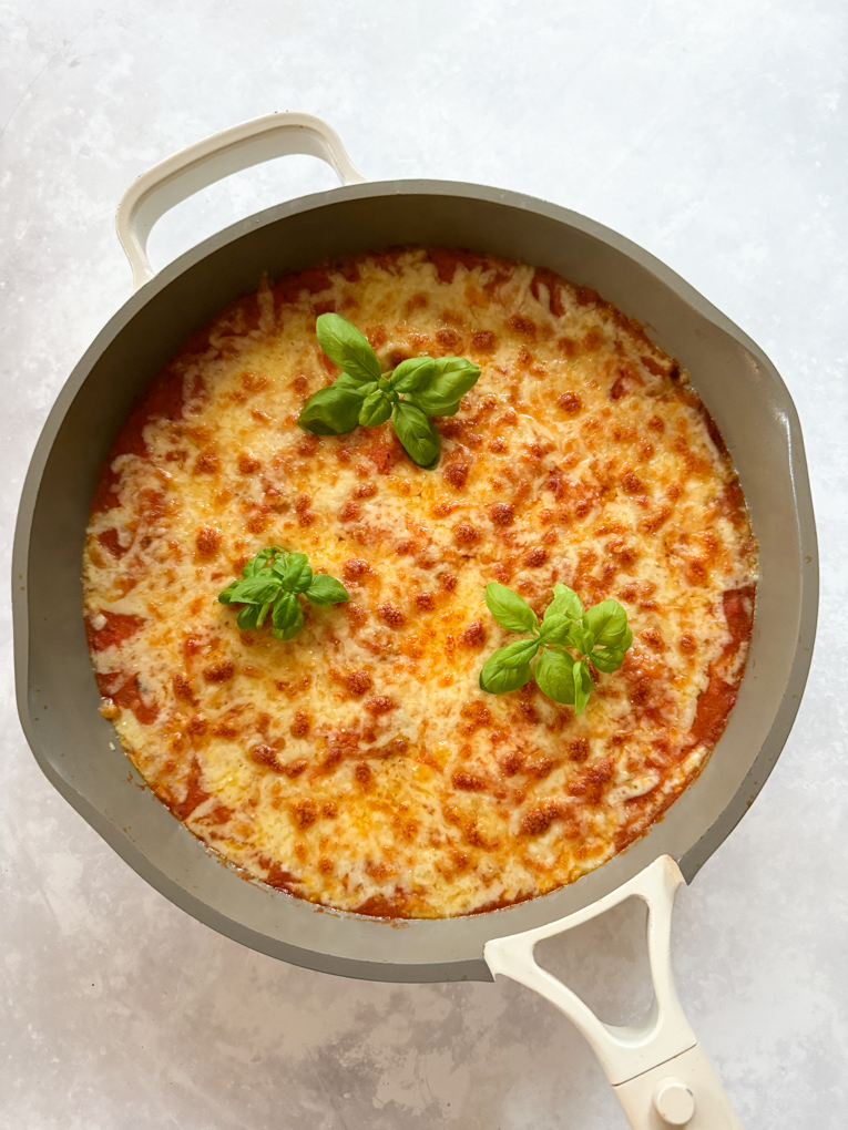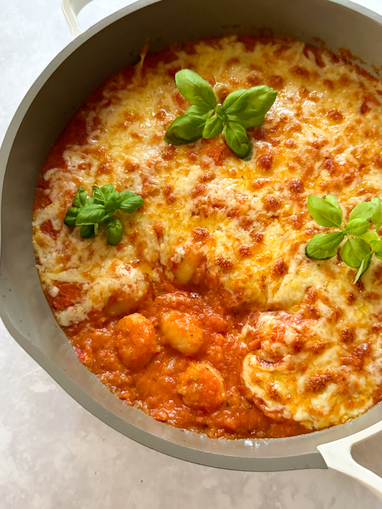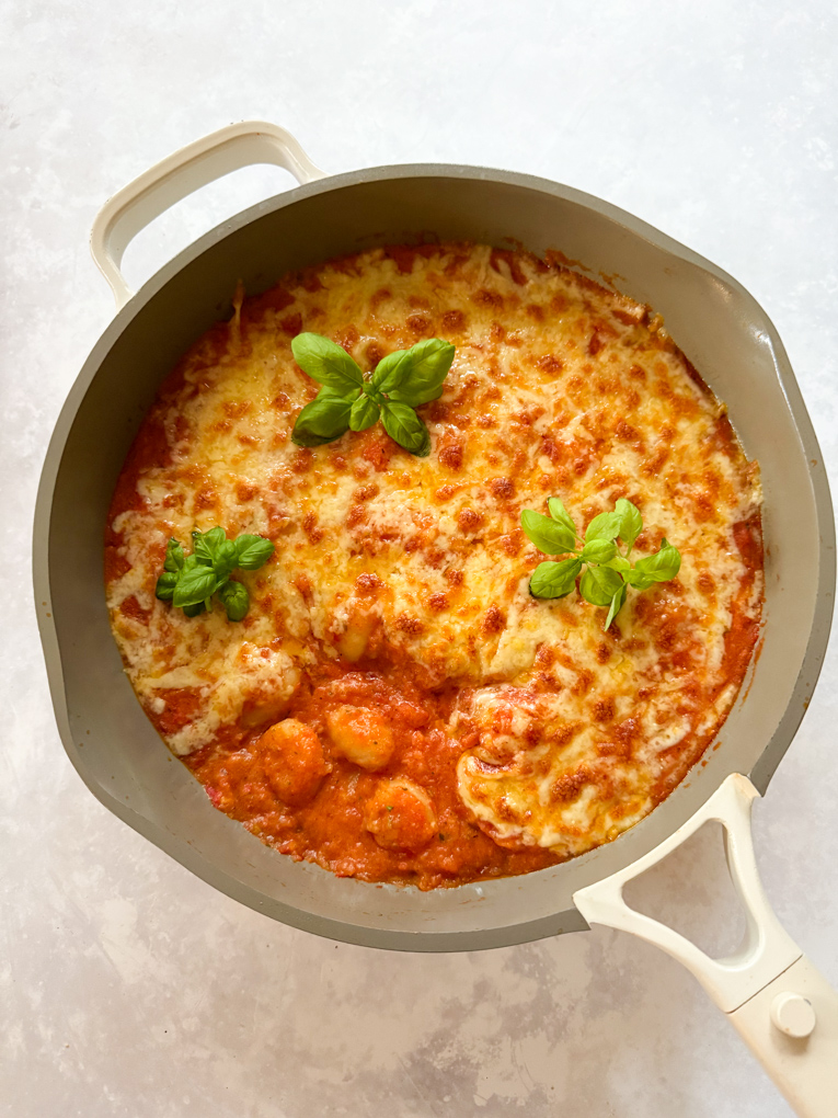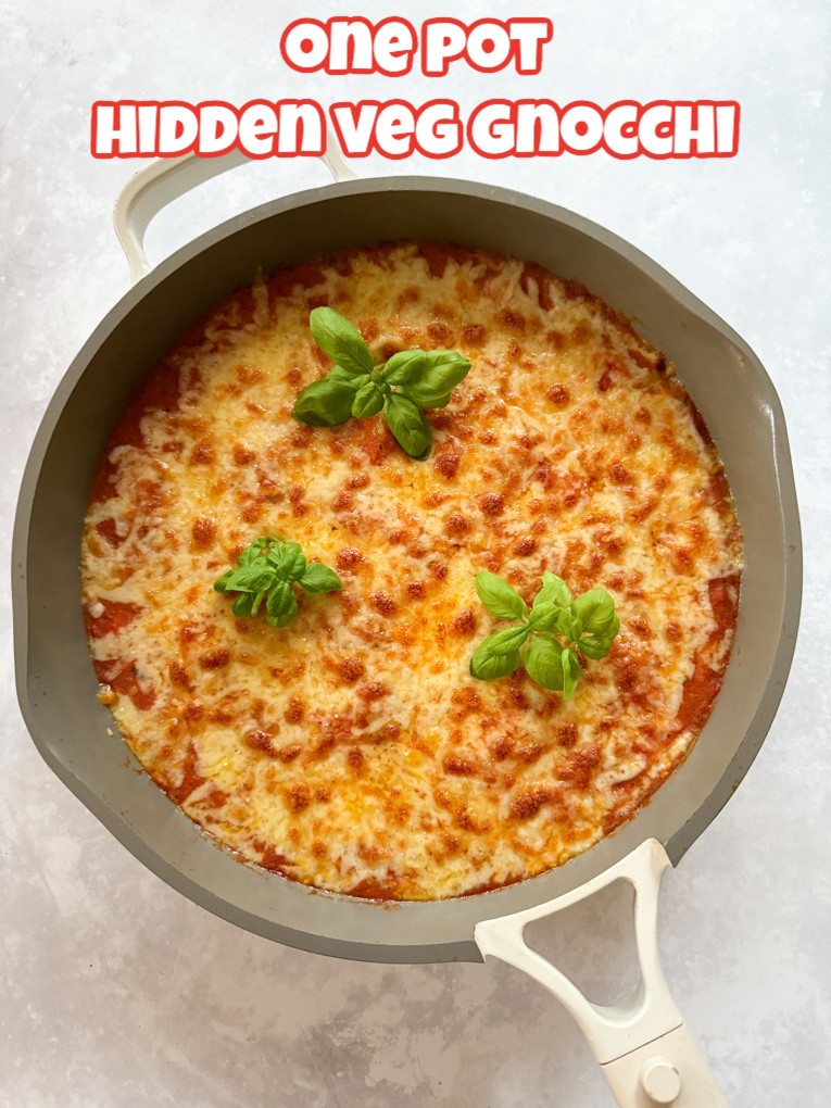An easy one pot family meal recipe; gnocchi with three hidden vegetables topped with mozzarella cheese.