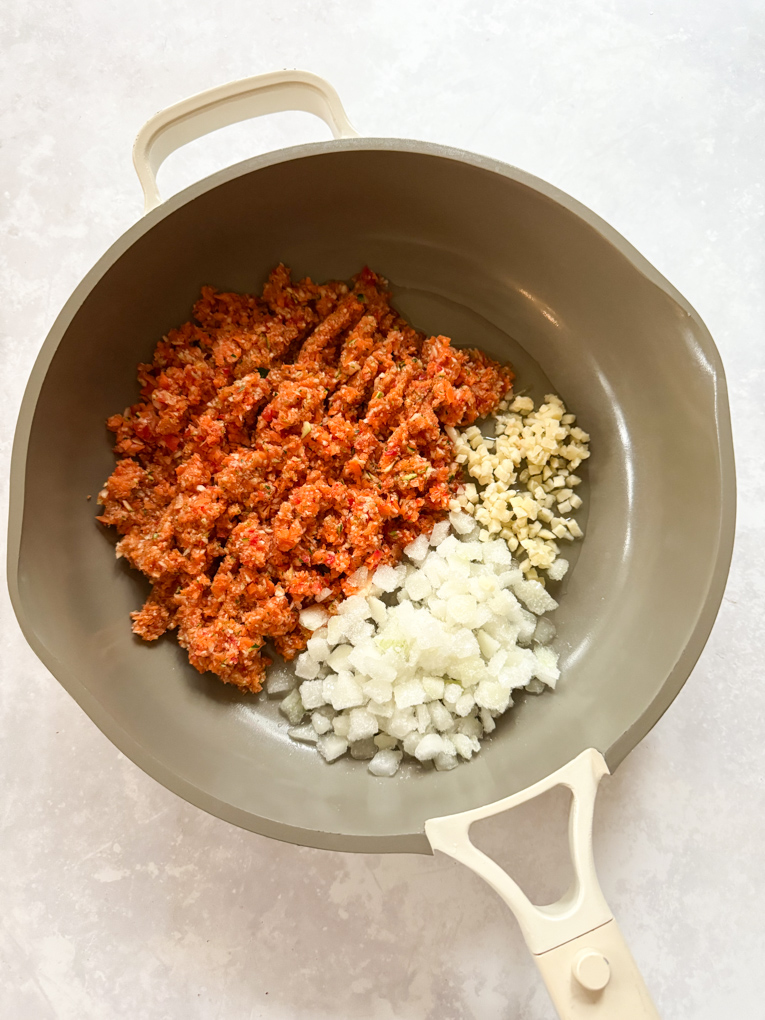 - Cut the carrot, courgette and red pepper into large chunks and add to a chopper or food processor. Blitz until the veggies are cut into very fine pieces.