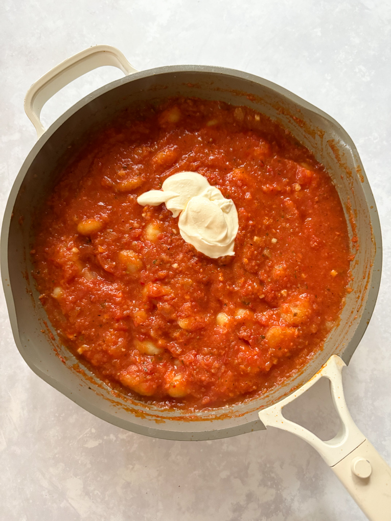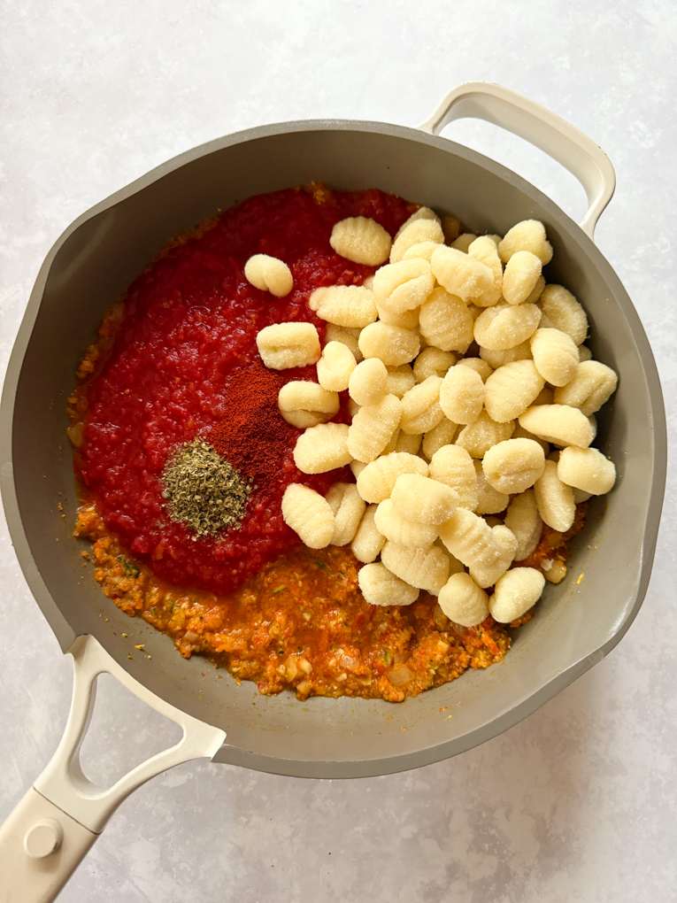 - Add the chopped tomatoes, vegetable stock, oregano, smoked paprika, a little salt and pepper and the gnocchi.
