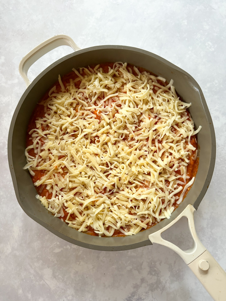- Add the grated cheddar and mozzarella on top and pop the pan under the grill for a couple of minutes to brown the cheese.