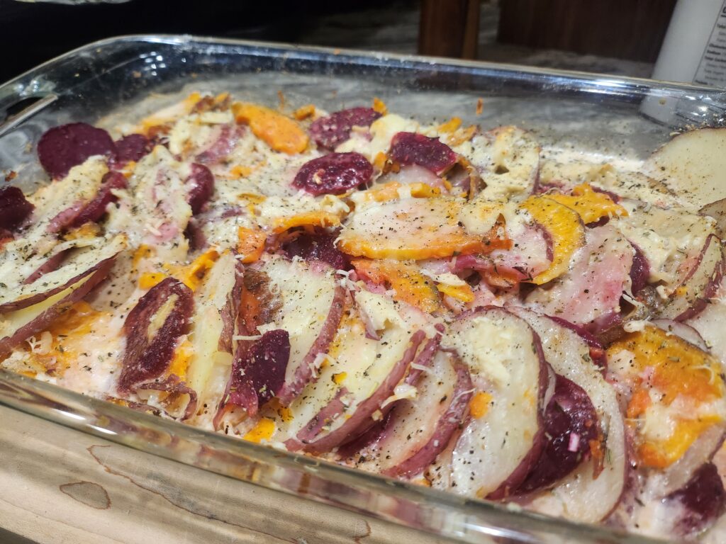 If there’s one side dish that reliably wins over kids, adults, and that one uncle who claims he “doesn’t like vegetables”, it’s this light and cozy root vegetable gratin. Picture thin-sliced potatoes, sweet potatoes, carrots, parsnips, turnips, and beets tucked into tender, cozy layers, bubbling away in a creamy (but not heavy) milk or plant-milk base, topped with just enough Parmesan and Gouda to make it irresistible — not intense.